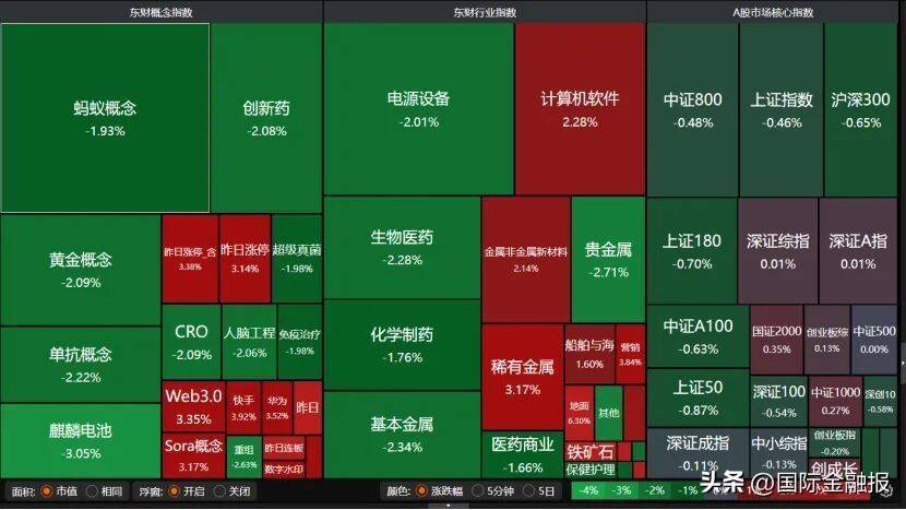 盘面上,创新药、电源设备、黄金概念、麒麟电池领跌,计算机软件、金属非金属新材料、稀有金属、铁矿石、Sora概念涨势不错。
