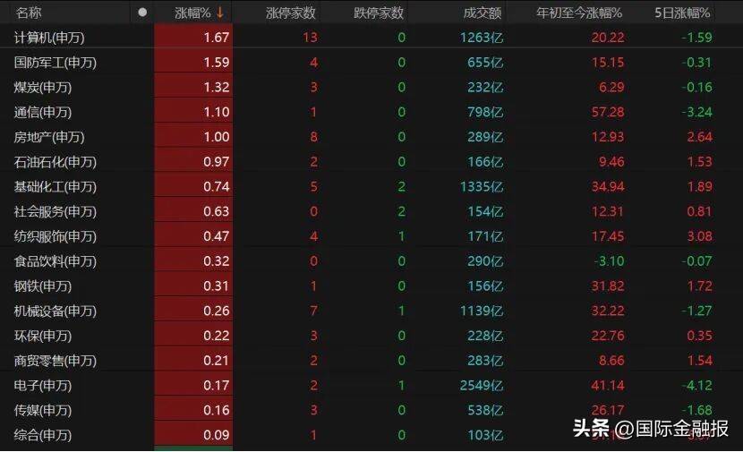 计算机、国防军工、煤炭、通信、房地产板块涨幅均不低于1%,长城军工、江龙船艇等4只军工股涨停,安泰集团、美锦能源、大有能源涨停。